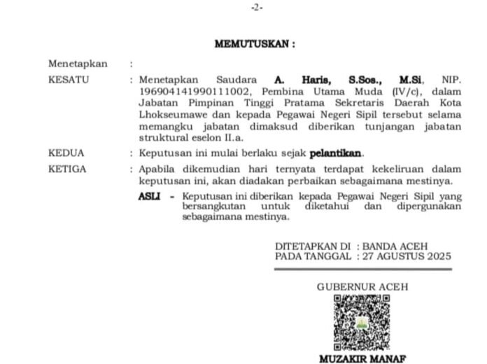 Walikota Lhokseumawe kepada Beurita.Com, Jumat (29/8/2025) membenarkan bahwa gubernur telah menetapkan A Haris sebagai sekda. “Beutoi,” katanya.