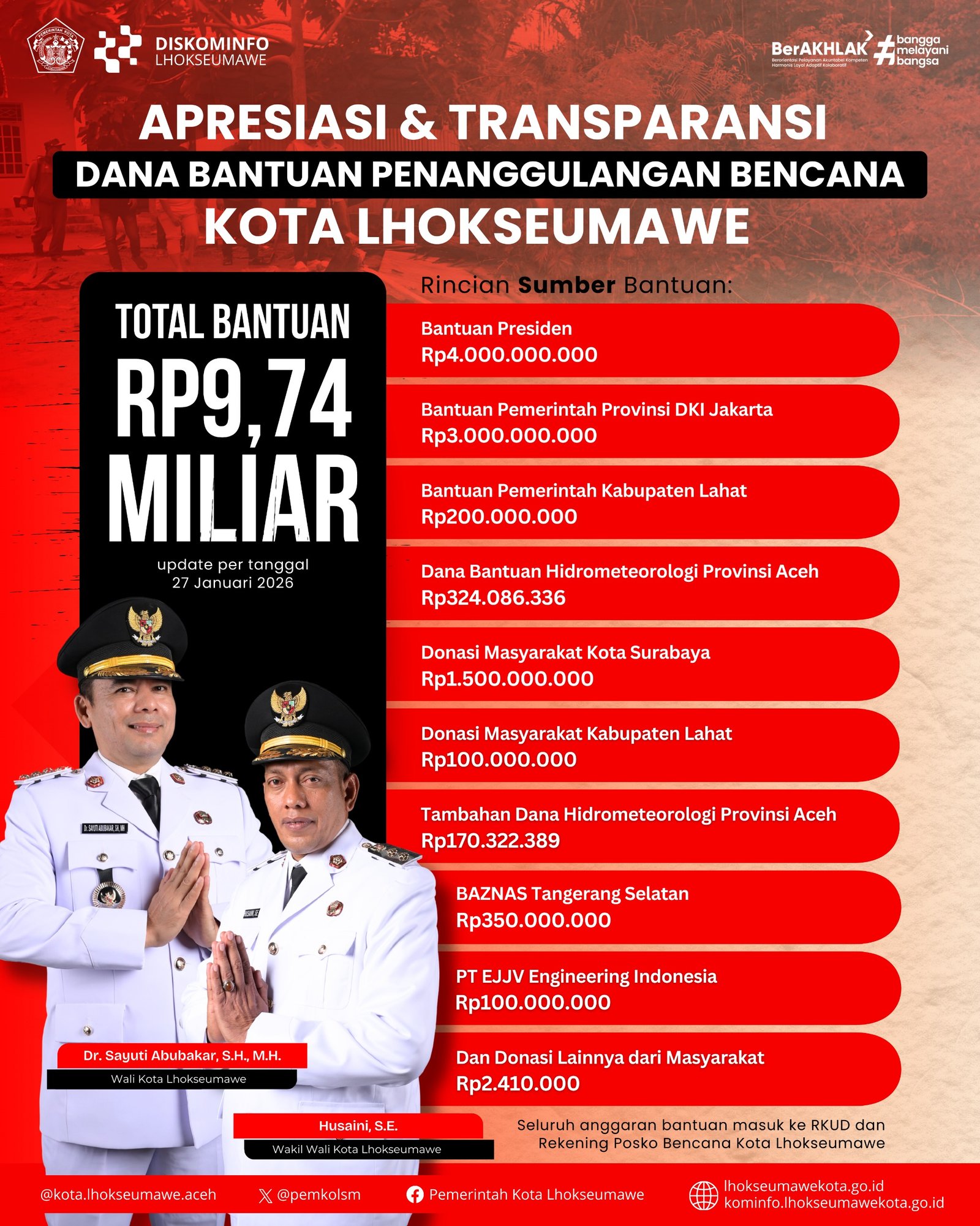Walikota Lhokseumawe Dr Sayuti Abubakar SH MH mengatakan, bantuan ini merupakan hasil dari komunikasi, koordinasi, dan kerja sama lintas daerah serta solidaritas berbagai pihak yang peduli terhadap kondisi masyarakat Lhokseumawe pascabencana. “Alhamdulillah, ini adalah wujud kepedulian dan solidaritas bersama. Bantuan ini akan kita kelola secara transparan dan tepat sasaran untuk pemulihan infrastruktur serta pemulihan kondisi masyarakat,” ujar Dr Sayuti.
