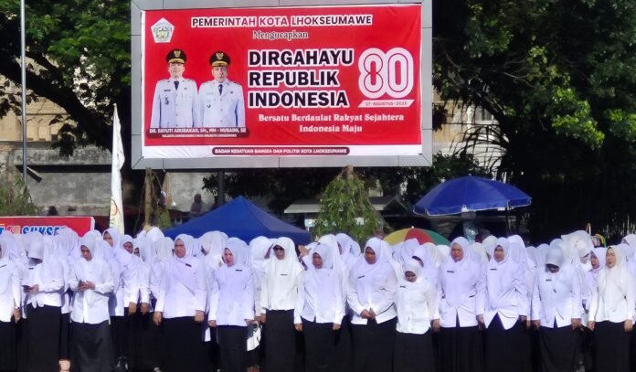 LHOKSEUMAWE|BEURITA.Com-Sebanyak 1.990 Pegawai Pemerintah Dengan Perjanjian Kerja (PPPK) tahun 2025 diserahkan SK oleh Walikota Lhokseumawe Dr Sayuti Abubakar SH MH. Seremonial acara penyerahan SK dikemas dalam upacara di Lapangan Hiraq, Senin (1/9/2025). Bahasa yang digunakan pada kesempatan itu adalah Bahasa Aceh.