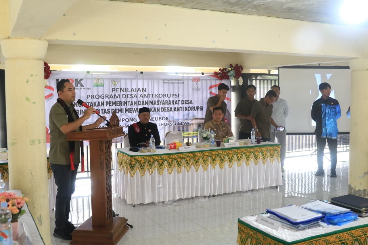 Walikota Lhokseumawe Dr Sayuti Abubakar SH MH membuka acara penilaian desa anti korupsi, Kamis (6/11/2026) di Meunasah Desa Seunebok. Ia mengupas tentang integritas serta komitmen pemerintah untuk memerangi korupsi yang dimulai ditingkat gampong.