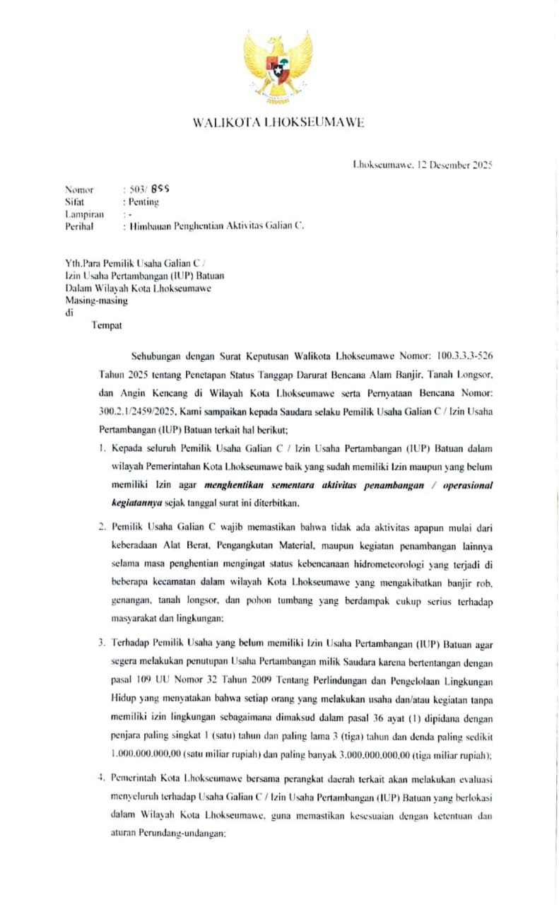 - Kepada seluruh pemilik usaha galian CI lzin Usaha Pertambangan (IUP) dalam wilayah Pemerintahan Kota Lhokseumawe baik yang sudah memiliki lzin maupun yang belum memiliki lzin agar menghentikan sementara aktivitas penambangan / operasional kegiatannya sejak tanggal surat ini diterbitkan.